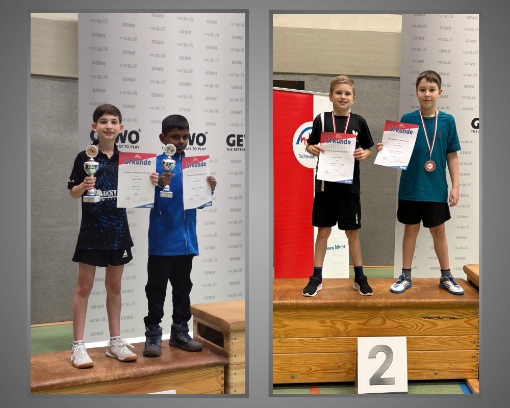 Bei der letzten Großveranstaltung in diesem Jahr, den Hessischen Tischtennislandesmeisterschaften nahmen drei Teilnehmer der DJK TTC Ober-Roden teil. Bei der Jugend 11 konnte Micha Schwinn mit seinem Partner aus Hoechst die Vize-Landesmeisterschaft im Doppel gewinnen. (Bild Jugend 11 rechts). Sein Vereinskollege Leon Klees wurde Dritter im Doppel. Beide konnten sich im Einzel für die Hauptrunde qualifizieren. In der höheren Altersklasse Jugend 15 erspielte sich Adrian Klees im Einzel nach einer knappen Niederlage im Halbfinale (Bild Jugend 15 links) den dritten Platz, den er auch im Doppel erreichte.